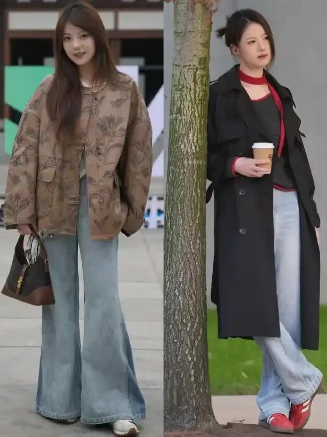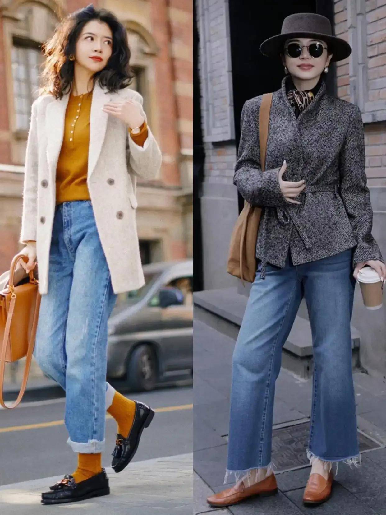 想要轻熟风的气质比较成熟稳重的,自然选择一双黑色的皮鞋来搭配上牛仔裤,加上红色的大衣短外套会更合适。