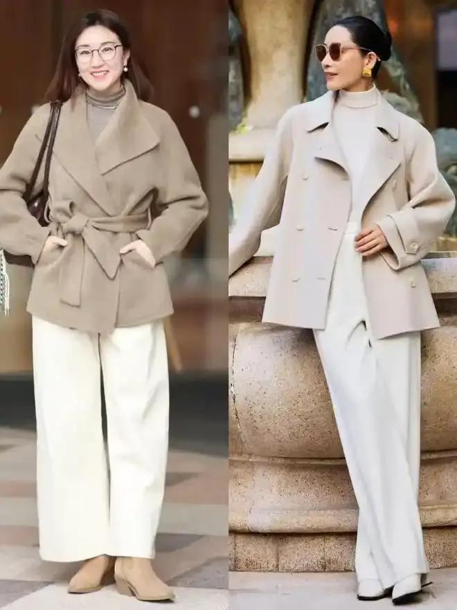 年龄在奔 3 奔 4 这个阶段,或者是个子比较高,长相偏成熟的,我们可以选择带跟的鞋子,短靴就可以搭配上一条白色西装裤和短大衣外套,这样能更容易的呈现出你的气质和魅力。
