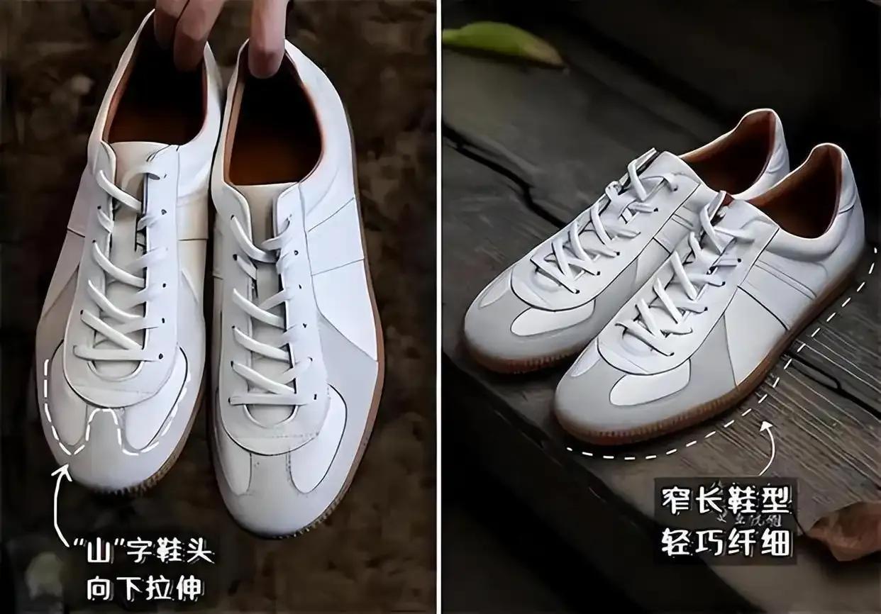像上面这一双德训鞋,做了一个山字斜头设计,向下拉伸,整体的鞋型是窄长款式,穿在脚上轻巧纤细,不会显得笨重。